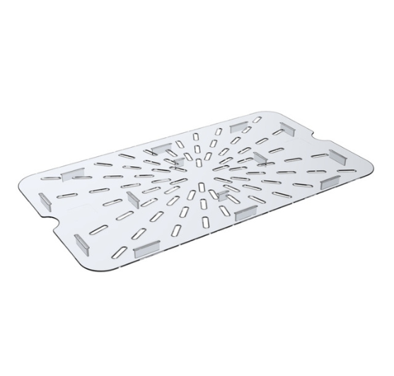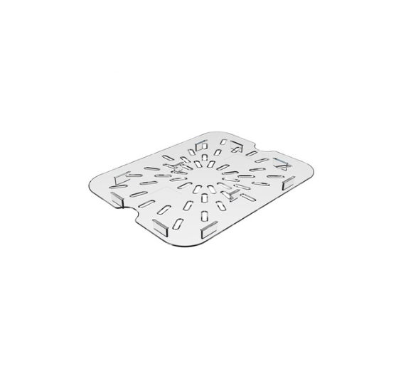 En options: Plateaux égouttoir – Moyen rapide et pratique d’égoutter les aliments. Solution idéale pour décongeler et faire mariner – Forme en dôme pour égoutter – Bonne circulation d’air et protection contre l’humidité – Nouveau type de perforation avec arêtes adoucis pour une bonne préservation des denrées