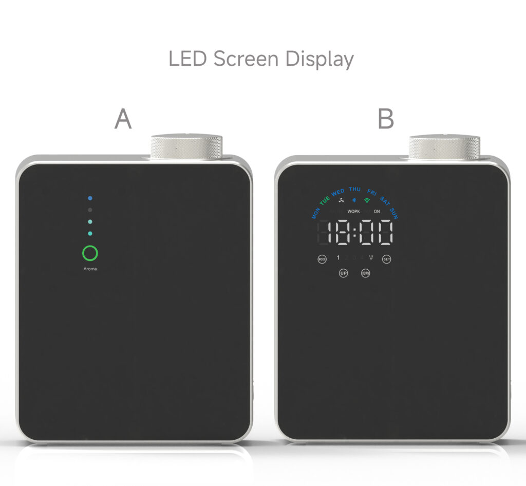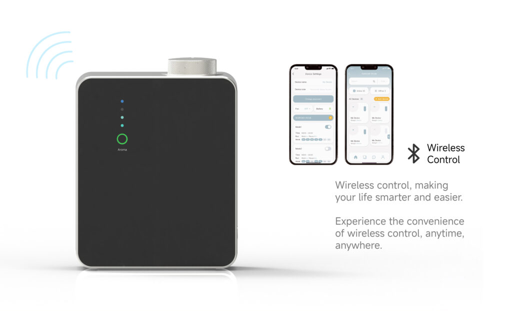 Ce diffuseur d’huile essentielle smart professionnel fonctionne via une technologie de nébulisation sèche, sans chaleur ni eau, garantissant une préservation optimale des propriétés olfactives. Il peut être installé au mur ou posé sur un meuble, et se connecte facilement à un système de ventilation (HVAC) pour une diffusion centralisée dans tout le local. Sa consommation optimisée (≈ 1,7 g/h) et son fonctionnement silencieux (≤ 42 dB) en font un appareil idéal pour un usage professionnel quotidien.