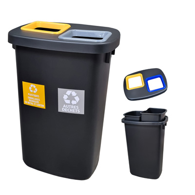 Poubelle de tri sélectif 90 litres à deux compartiments, idéale pour un recyclage efficace et une gestion des déchets simplifiée. Parfait pour les espaces résidentiels et professionnels, elle favorise le respect de l’environnement et une organisation optimale.
