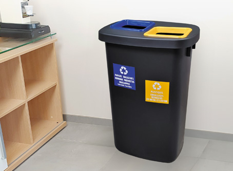 Poubelle de tri sélectif 90L à deux compartiments sélectifs, une solution écologique, ergonomique et ultra-résistante pour une gestion optimisée des déchets. Conçue en plastique recyclé haute qualité polypropylène, elle dispose de deux compartiments de 45L pour un tri efficace et intuitif. Son couvercle à ouverture centrale assure un usage hygiénique et sans contact, idéal pour les espaces de vie commune des bureaux, ateliers, usines, espaces publics. Grâce à ses arceaux métalliques, le sac reste parfaitement maintenu sans débordement, garantissant propreté et praticité. Avec son design contemporain et robuste, elle allie esthétique, durabilité et performance environnementale.