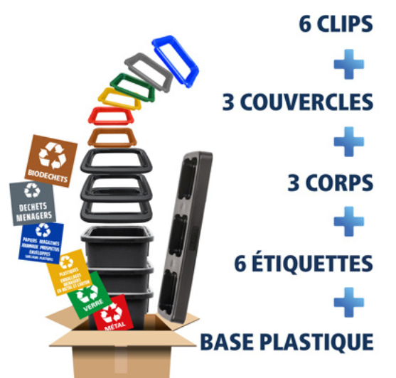 Cette poubelle de tri sélectif 53 litres est conçue pour faciliter le recyclage des déchets grâce à un système de tri efficace et des couvercles colorés pour chaque type de flux : flux de papier, journaux, magazines, prospectus, enveloppes (couvercle bleu), flux de plastiques, emballages, ménagers en carton ou métal (couvercle jaune), flux de déchets ménagers (couvercle gris), flux de verre (couvercle vert), flux de métal (couvercle rouge) et flux de biodéchets (couvercle marron). Cette poubelle de tri compartimentée 53 litres est la solution idéale pour faciliter le recyclage, encourager le tri des déchets.